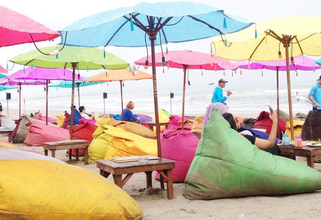Tempat duduk yang kami pilih berada diarea outdoor alias ditepian pantai. Berbagai warna-warni bantal (bean bag) yang terhampar membuat suasana pantai terlihat sangat meriah. Ditambah lagi payung-payung yang juga berwarna-warni tertancap disana-sini. Jadi tidak perlu khawatir bagi anda yang takut berjemur dibawah matahari, karena ada payung yang akan selalu melindungi.